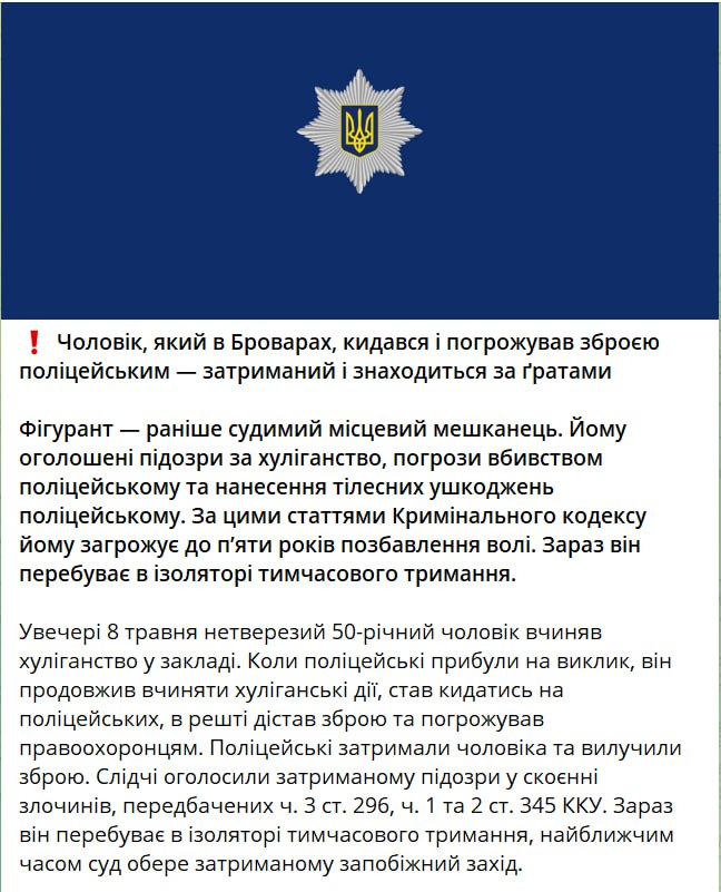 Позже в Национальной полиции сообщили, что мужчина в Броварах, плевавший в полицейского и угрожавший оружием, задержан.