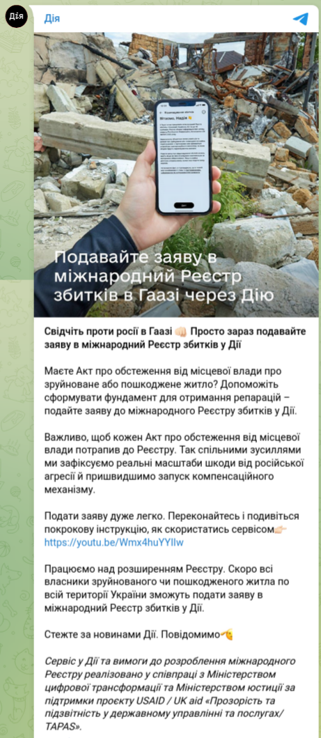 "Важно, чтобы каждый акт об обследовании от местных властей попал в реестр. Так совместными усилиями мы зафиксируем реальные масштабы ущерба от российской агрессии и ускорим запуск компенсационного механизма. В скором времени все владельцы разрушенного или повреждённого жилья по всей территории Украины смогут подать заявление в международный реестр убытков в "Дии", – пишут разработчики.