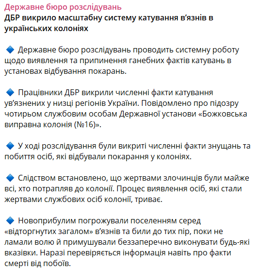 Государственное бюро расследований (ГБР) разоблачило масштабную систему пыток заключенных в колониях в ряде регионов Украины.