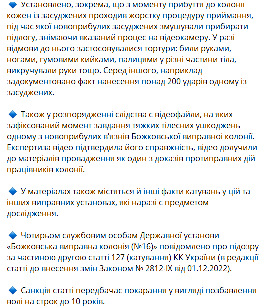 В частности, подозрения получили четыре сотрудника "Божковской исправительной колонии (№16)" в Полтавской области.