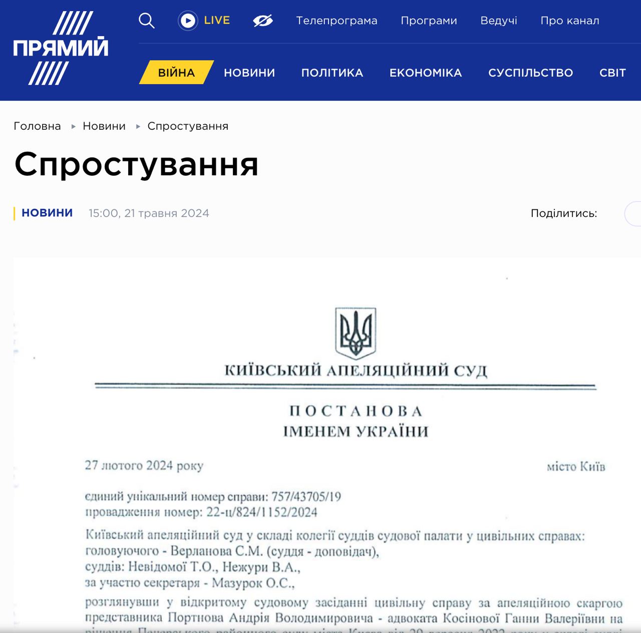 Публикация появилась на сайте канала 21 мая. В ней самого опровержения нет, однако под заголовком "Опровержение" вывешено постановление суда, обязывающее опровергнуть слова Порошенко.