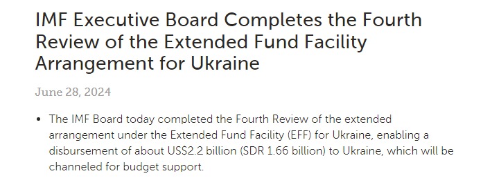 "Совет МВФ сегодня завершил четвертый пересмотр расширенного соглашения в рамках механизма расширенного финансирования (EFF) для Украины, что позволило выделить Украине около 2,2 миллиарда долларов США, которые будут направлены на поддержку бюджета. В результате общий объем выплат по программе, поддерживаемой МВФ, составит около $7,6 млрд", - сказано в пресс-релизе.