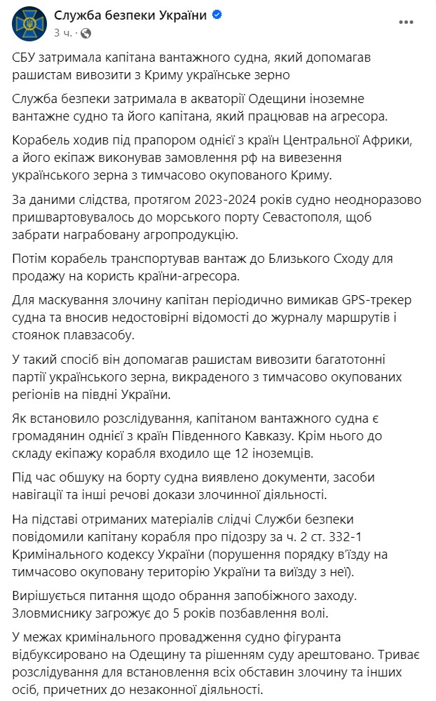 СБУ задержала капитана грузового судна, который помогал РФ перевозить украинское зерно из Крыма