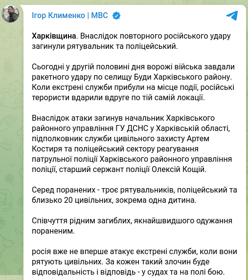 Глава МВД Игорь Клименко в своем телеграм-канале сообщил о двух погибших вследствие сегодняшнего удара РФ по предместью Харькова.