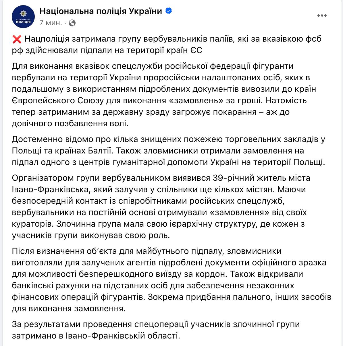 По подозрению в вербовке "пророссийски настроенных лиц" для выполнения поджогов в Евросоюзе задержали 39-летнего жителя Ивано-Франковска, который привлек к этой деятельности еще нескольких украинцев.
