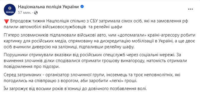 Пятеро злоумышленников поджигали военные авто, а еще двое совершили диверсию на железной дороге, повредив релейный шкаф. Нарушители получали указания от российских спецслужб через социальные сети.