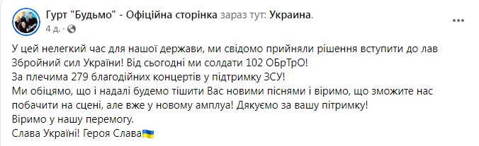 "В это нелегкое время для нашего государства время мы сознательно приняли решение вступить в ряды Вооруженных сил Украины! С сегодняшнего дня мы солдаты 102-й ОБрТрО! За плечами 279 благотворительных концертов в поддержку ВСУ. Мы обещаем, что и дальше будем радовать вас новыми песнями и верим, что сможете нас увидеть на сцене, но уже в новом амплуа", - сказано в публикации.