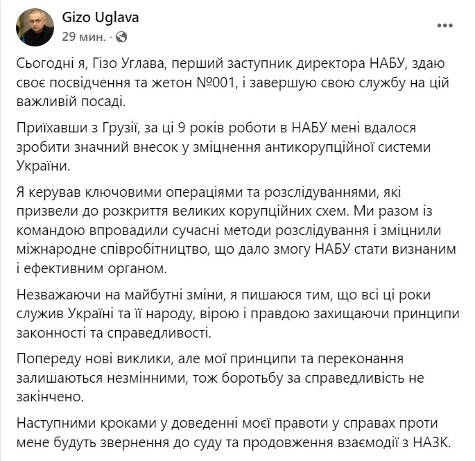 Глава Национального антикоррупционного бюро Семен Кривонос уволил своего первого заместителя Гизо Углаву. Об этом сообщает пресс-служба ведомства.