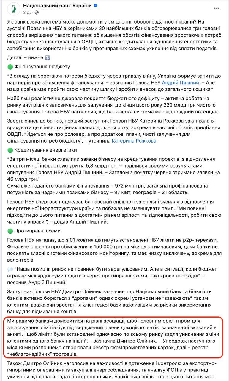 "Мы советуем банкам договориться на уровне ассоциации, чтобы главным ориентиром для применения лимитов был подтвержденный уровень доходов клиентов, указанный в анкете. И чтобы лимиты были установлены одновременно по всему рынку во избежание смены клиентами одного банка на другой", - заявил замглавы НБУ Дмитрий Олейник.