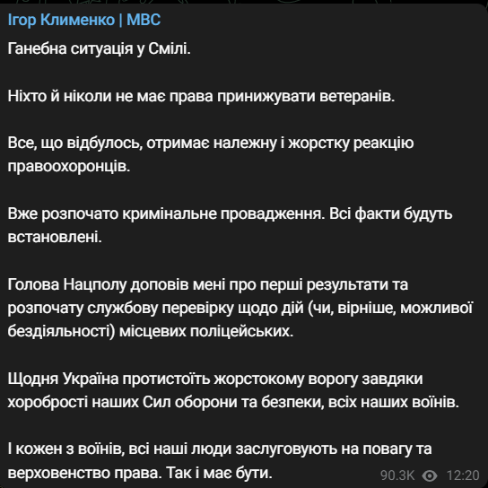 Глава МВД Клименко называет ситуацию "позорной" и обещает "должную и жёсткую реакцию" за унижение ветерана и возможное бездействие полиции.
