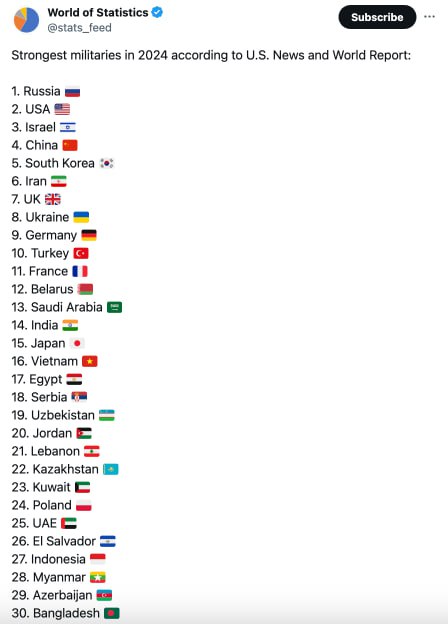 Войска США, Израиля и Китая - на 2, 3 и 4 местах соответственно. Следом за ними располагаются Южная Корея, Иран и Великобритания.