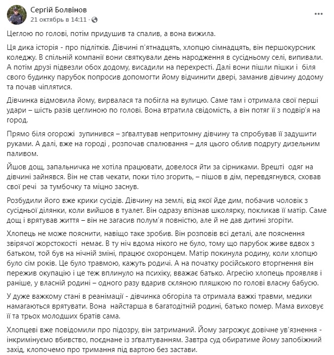 В Харьковской области юноша избил кирпичом, изнасиловал и поджег девочку. Она умерла