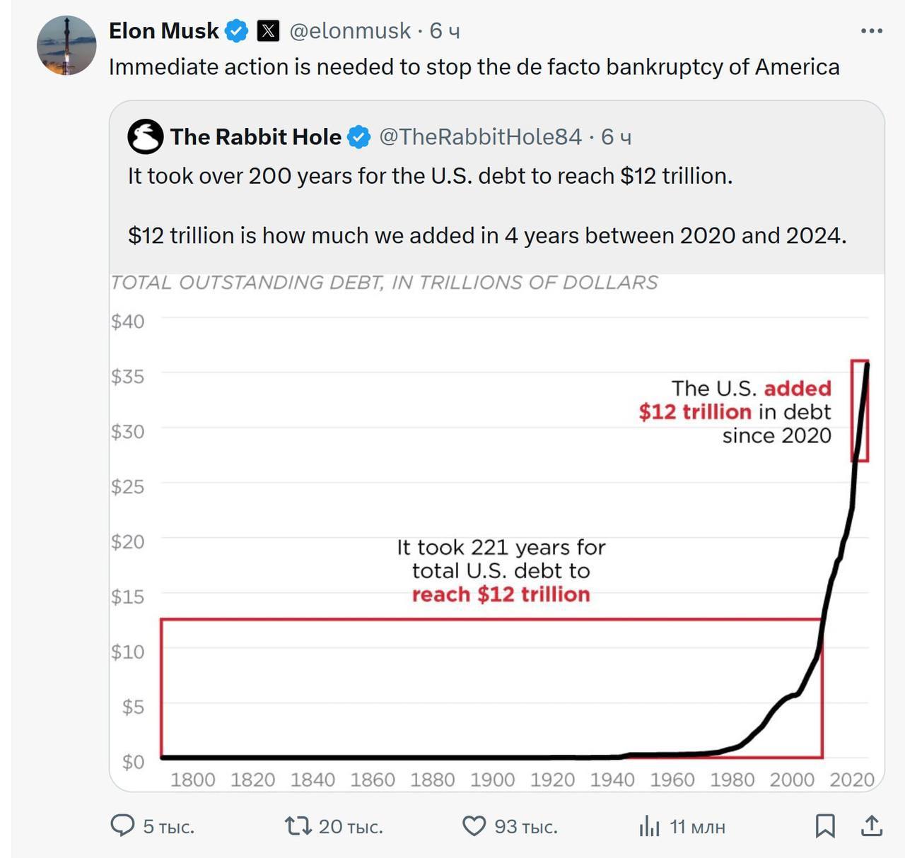 "Необходимы немедленные действия, чтобы остановить фактическое банкротство Америки", - прокомментировал близкий к Трампу предприниматель пост о том, что госдолг США в 2020-2024 годах вырос на 12 трлн долларов.