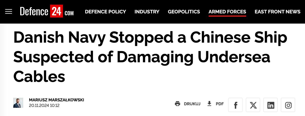 Военно-морские силы Дании задержали китайский сухогруз Yi Peng 3 по подозрению в повреждении телекоммуникационных кабелей в Балтийском море. Судно привлекло внимание военных странным маршрутом.