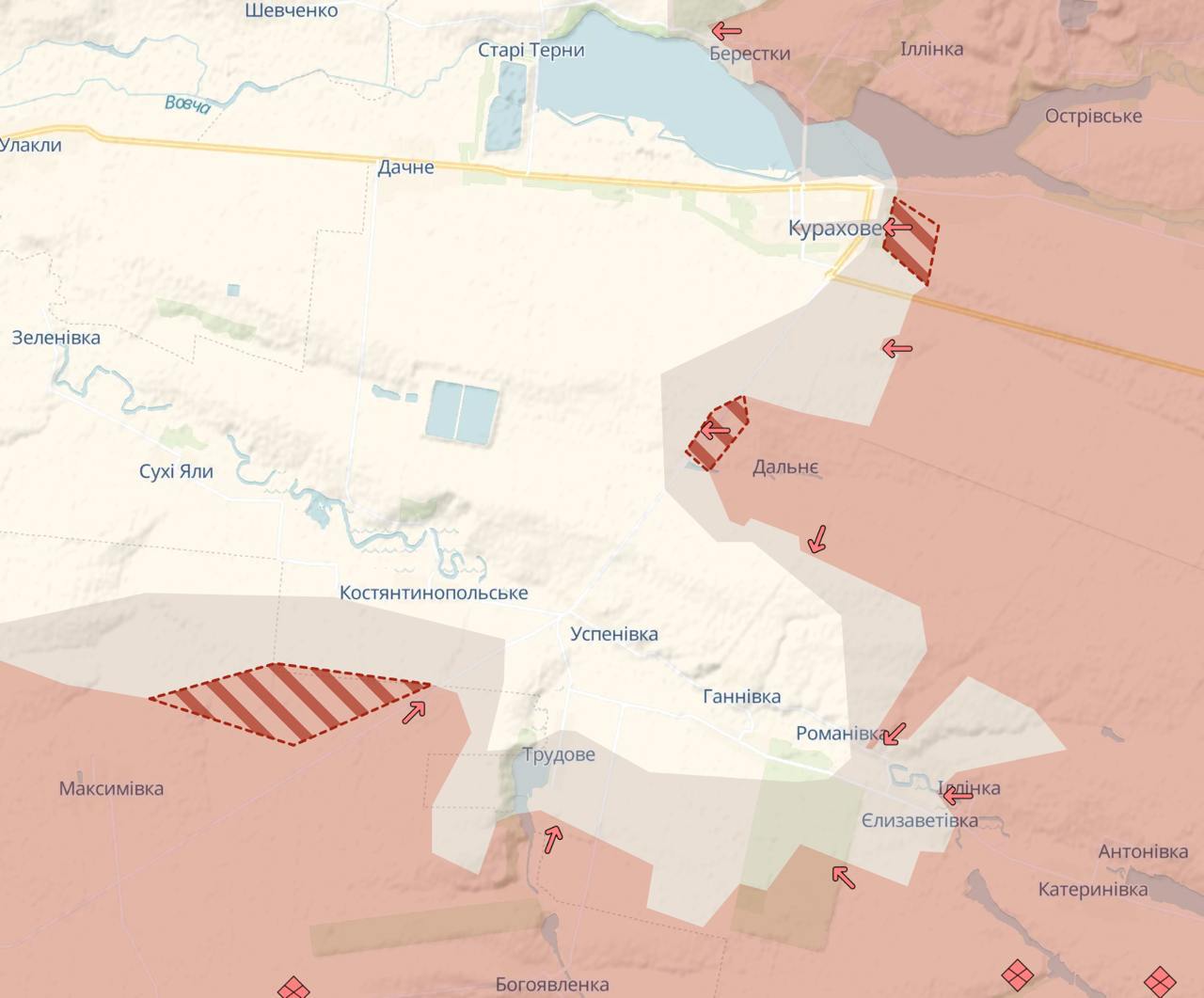 Судя по ней, россияне штурмовали одну улицу, но закрепиться в центре им не удалось. Однако у них есть продвижение южнее города - возле Дальнего и Максимовки.