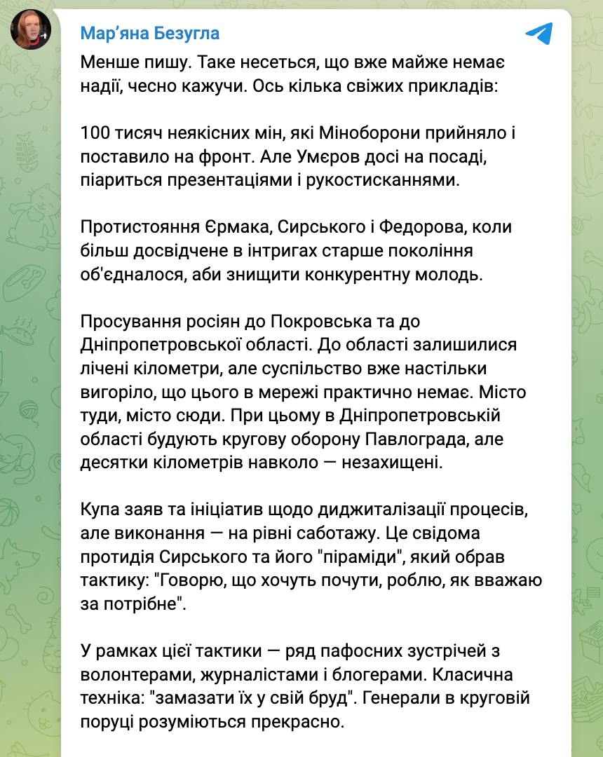- "Продолжение уничтожения проактивных лидеров в армии. Болтовня о "невероятной операции на Курщине", которая раньше "спасла Сумы", а теперь, оказывается, и Запорожье".