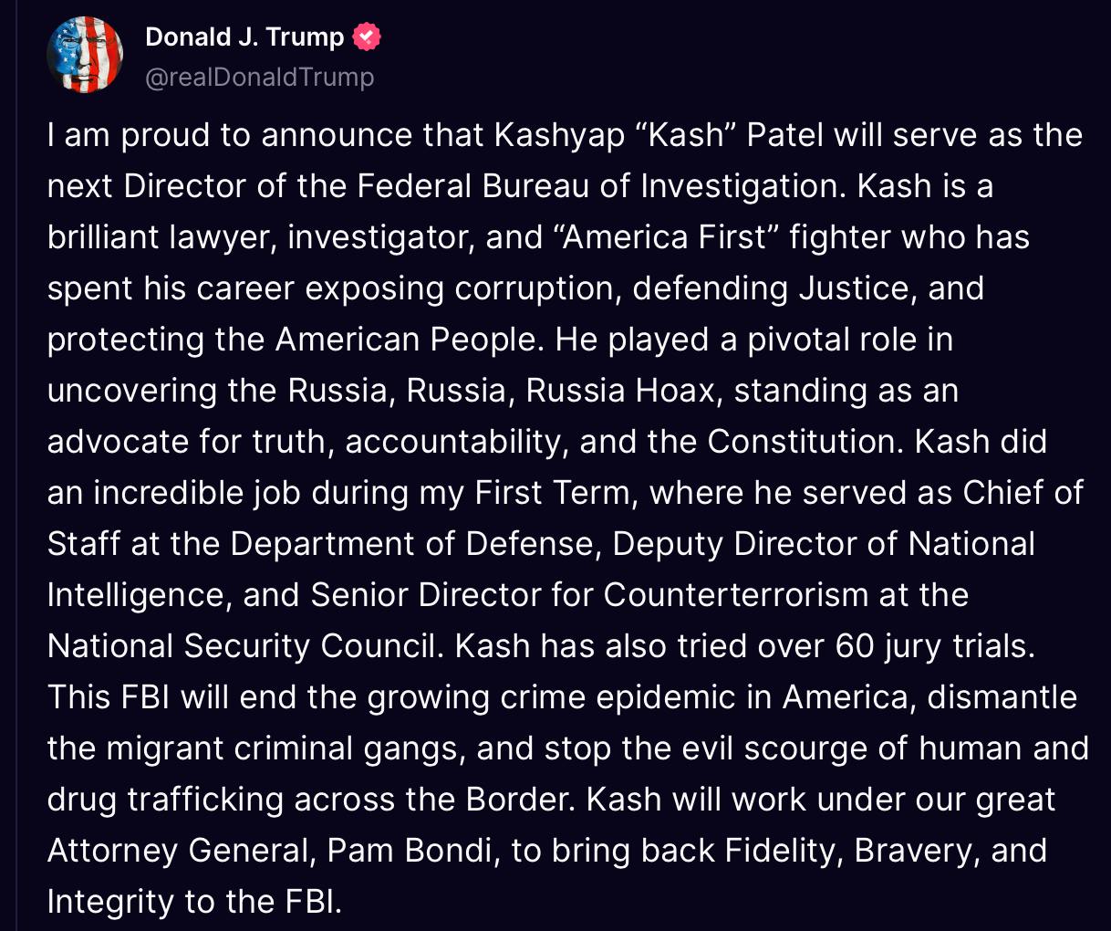 Республиканец выдвинул в директоры бюро Кэша Патела, который занимал при первом президентстве Трампа должности в Пентагоне и Белом доме.