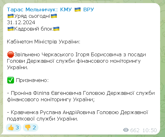 "Кабинетом министров Украины освобожден Черкасский Игорь Борисович с должности председателя Государственной службы финансового мониторинга Украины. Назначены Пронин Филипп Евгеньевич - председателем Государственной службы финансового мониторинга Украины, Кравченко Руслан Андреевич - председателем Государственной налоговой службы Украины", - сказано в публикации Мельничука.