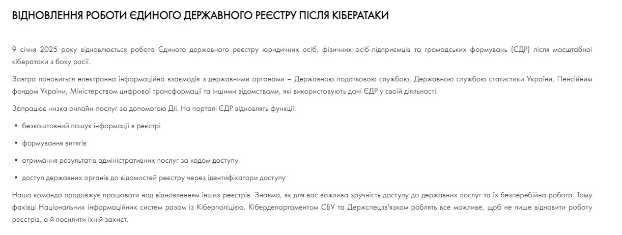 С сегодняшнего дня возобновляется работа Единого государственного реестра юридических лиц, физических лиц-предпринимателей и общественных формирований (ЕГР), который лег после масштабной кибератаки со стороны России.