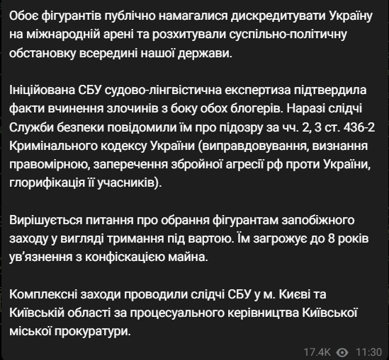 "По материалам дела, после начала полномасштабной войны фигурант создал свой канал на видеохостинге Ютуб, где продолжил распространять нарративы Кремля. Для этого блогер регулярно приглашал на свои эфиры пророссийских "политэкспертов", значительная часть из которых сейчас скрывается в РФ", - говорится в сообщении.
