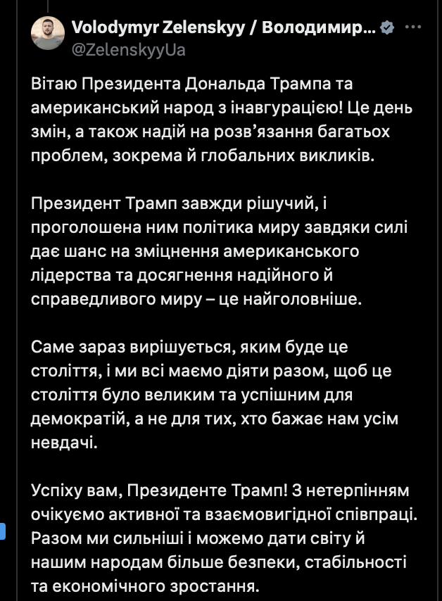 После вчерашней инаугурации Зеленский поздравил президента США дважды - один раз постом в соцсетях, второй - в вечернем обращении.