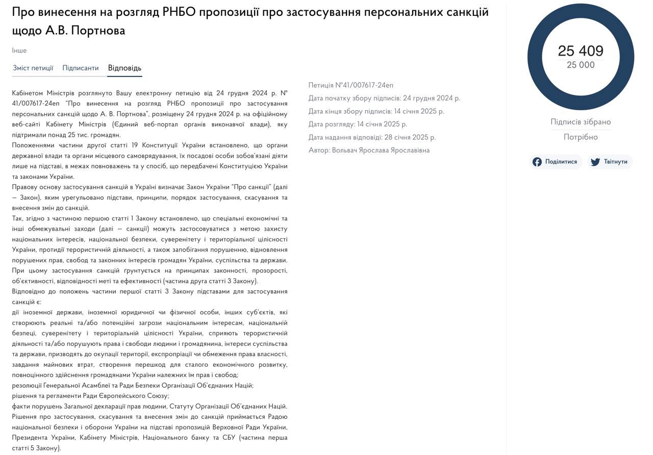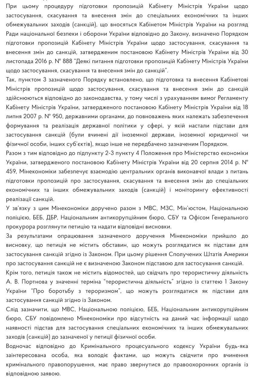 "Минэкономики пришло к выводу, что петиция не содержит обстоятельств, которые могут рассматриваться как основания для применения санкций согласно закону. При этом решение Соединенных Штатов Америки о применении санкций (против Андрея Портнова в 2021 году были введены санкции США - Ред.) не является определенным законом основанием для применения санкций. Кроме того, петиция также не содержит сведений, свидетельствующих о террористической деятельности Портнова. МВД, Национальная полиция, БЭБ, Национальное антикоррупционное бюро, СБУ сообщили Минэкономики об отсутствии в настоящее время информации о наличии оснований для применения специальных экономических и других ограничительных мер (санкций) к указанному в петиции лицу", - говорится в сообщении.