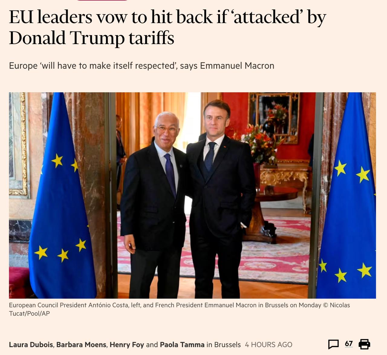 О готовности вводить ответные пошлины в отношении США также заявили президент Франции Эмманюэль Макрон и канцлер ФРГ Олаф Шольц, передает Financial Times.