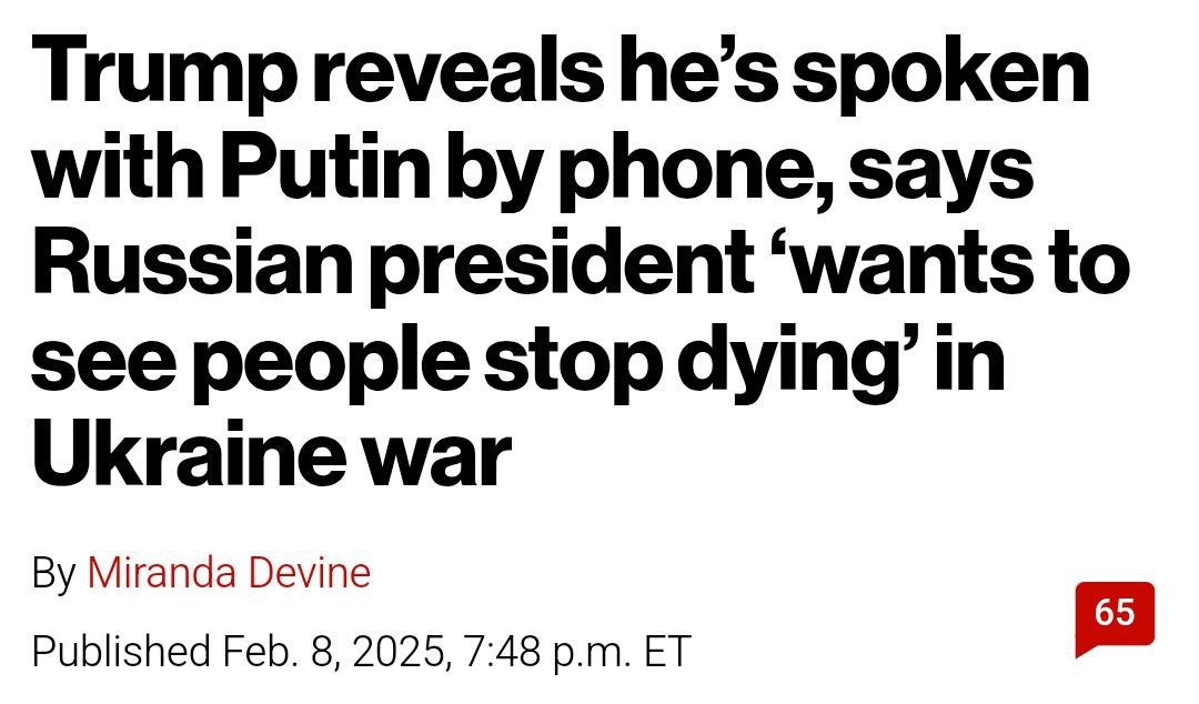 "Президент Трамп заявил, что провел телефонный разговор со своим российским коллегой Владимиром Путиным, и обсудил с ним прекращение войны в Украине. Трамп сказал, что российский президент хочет, чтобы люди перестали гибнуть", - пишет издание.