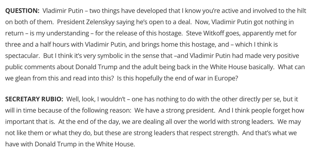 В ответ на это госсекретарь Марко Рубио встречи прямо не подтвердил и заявил, что "сильный президент" Трамп собирается прекратить войну в Украине.