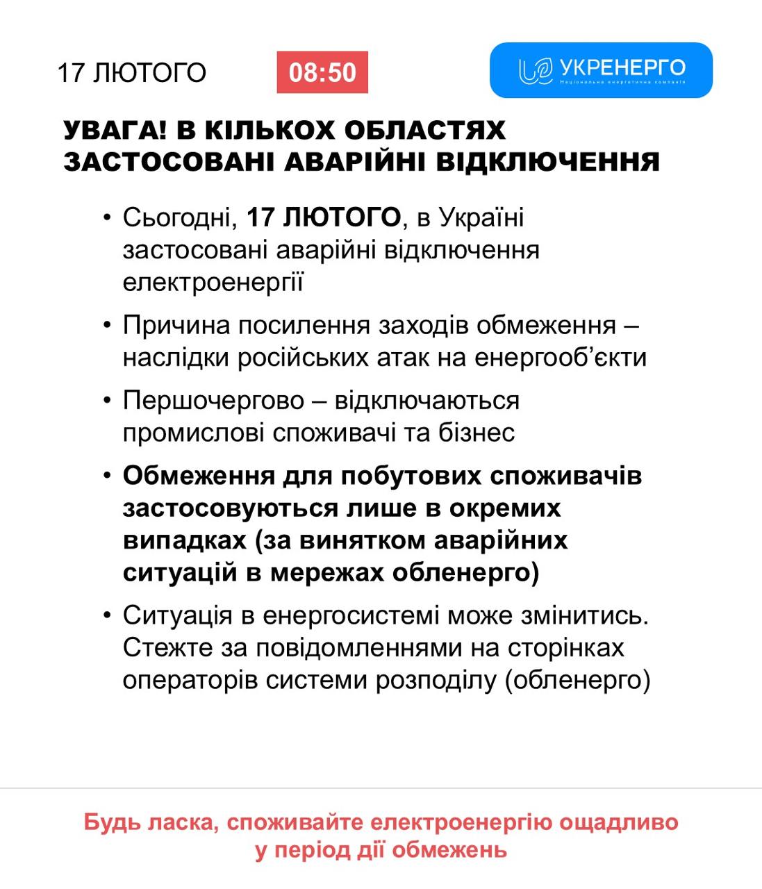 8.55 Отключения света вводятся по всей Украине из-за российских атак, заявляет "Укрэнерго".