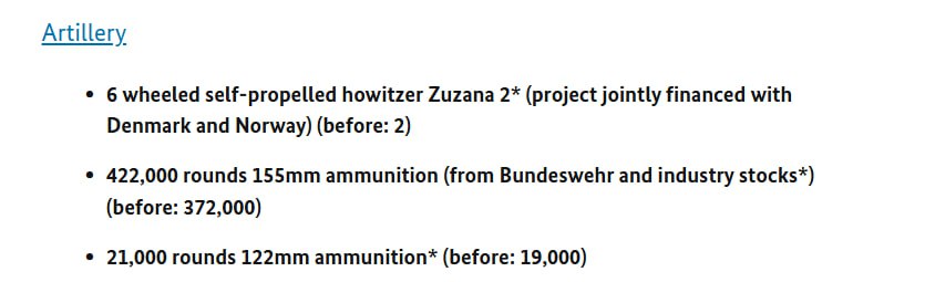 Заявлено, что в пакет войдут боеприпасы и ракеты разных типов, одна гаубица Zuzana 2, БПЛА, два танка для разминирования и стрелковое оружие.