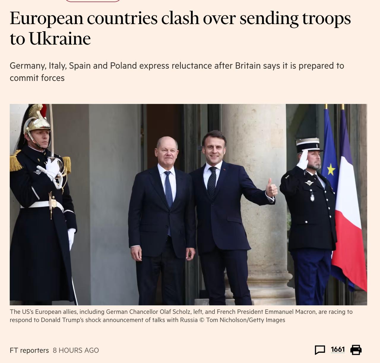 Шольц, как уже сообщалось, вообще назвал обсуждение вопроса о развертывании войск "крайне неуместным", поскольку война еще продолжается. Он сказал, что был "немного раздражен" дискуссией, назвав ее "непонятной дискуссией в неподходящее время и на неподходящую тему".