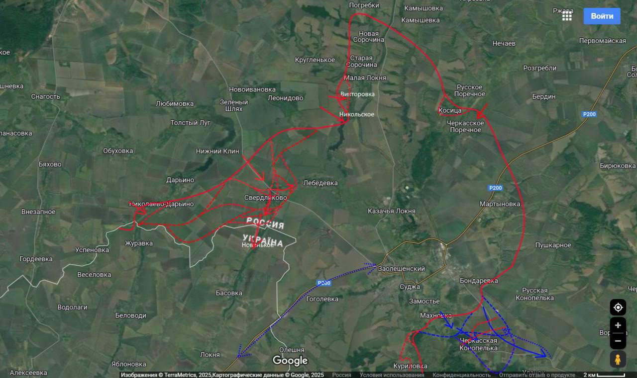 При этом российские военные паблики утверждают, что войска РФ атакуют от села Свердликино (которое, как заявляло МО РФ, было на днях возвращено под российский контроль) через границу в направлении сел Новенькое и Басово в Сумской области с дальнейшей целью перерезать трассу на Суджу. В то же время объективных подтверждений продвижения российских войск на этом направлении на данный момент нет.