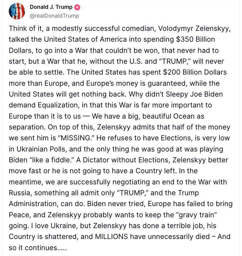 "Подумайте только: скромно успешный комик Владимир Зеленский убедил Соединенные Штаты Америки потратить 350 миллиардов долларов на войну, которую нельзя было выиграть, которая никогда не должна была начаться, но которую он без США и Трампа никогда не сможет урегулировать. США потратили на 200 миллиардов долларов больше, чем Европа, причем европейские деньги гарантированы, а США не получат ничего взамен. Почему же сонный Джо Байден не потребовал выравнивания, ведь эта война гораздо важнее для Европы, чем для нас, — у нас есть большой, красивый океан, который нас отделяет. Кроме того, Зеленский признает, что половина денег, которые мы ему отправили, "ПРОПАЛА". Он отказывается проводить выборы, его рейтинги в украинских опросах очень низкие, а единственное, в чем он преуспел — это в том, чтобы "играть" на Байдене, как на скрипке. Диктатор без выборов, Зеленскому лучше поторопиться, иначе у него не останется страны. Тем временем мы успешно ведем переговоры о прекращении войны с Россией — что, по мнению всех, может сделать только Трамп и администрация Трампа. Байден даже не пытался, Европа не смогла принести мир, а Зеленский, вероятно, хочет, чтобы "финансовый поток" продолжался. Я люблю Украину, но Зеленский проделал ужасную работу, его страна разрушена, и миллионы погибли напрасно - и это все продолжается…" - написал Трамп в своей соцсети.
