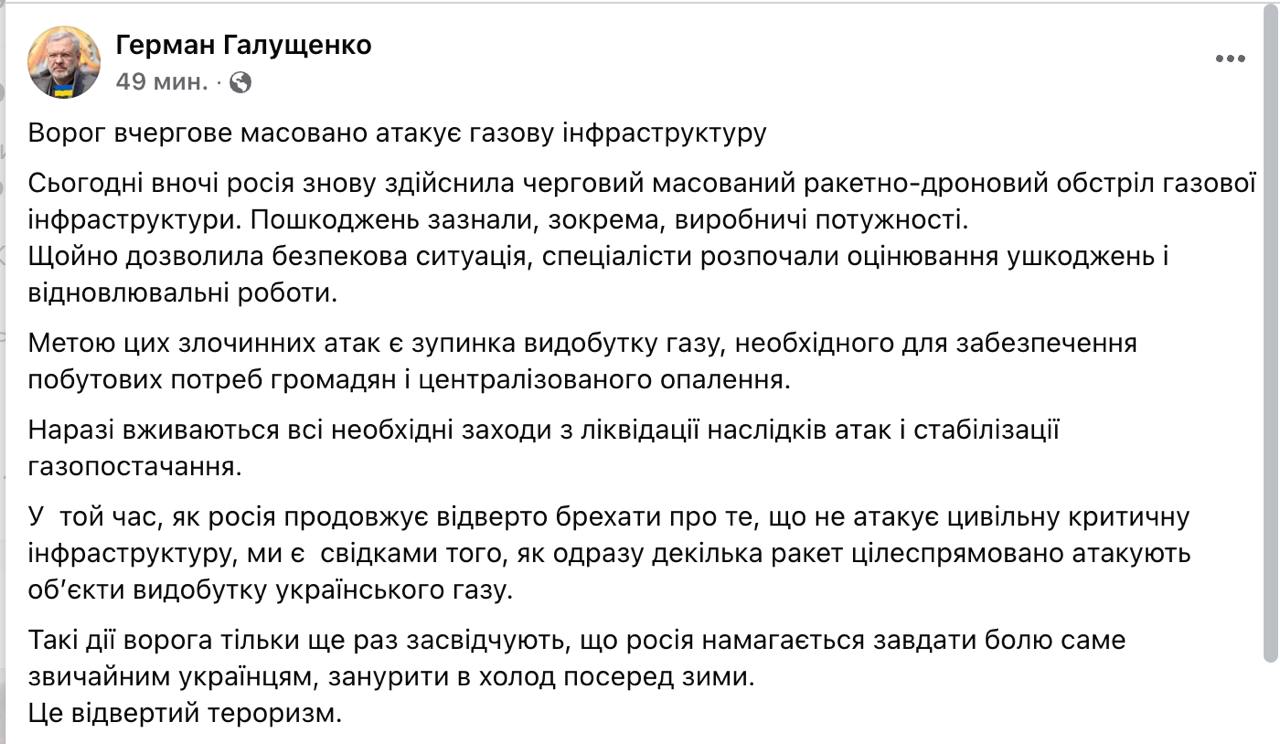 11:39 РФ ночью атаковала ракетами и дронами газовую инфраструктуру Украины, сообщает министр энергетики Галущенко.