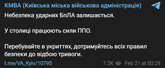 08:05 Сегодня ночью в Киеве работали силы и средства противовоздушной обороны из-за атаки российских ударных БПЛА.