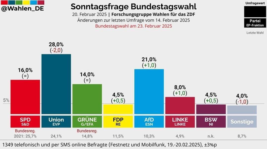 На втором месте - правая АдГ (21%), с которой глава блока ХДС/ХСС Мерц исключил возможность коалиции. У АдГ рейтинг подрос на 1%.