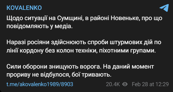"В настоящее время россияне предпринимают попытки штурмовых действий по линии границы без колонн техники пехотными группами. Силы обороны уничтожают врага. На данный момент прорыва не произошло, бои продолжаются", - пишет глава ЦПД при Совбезе Андрей Коваленко.