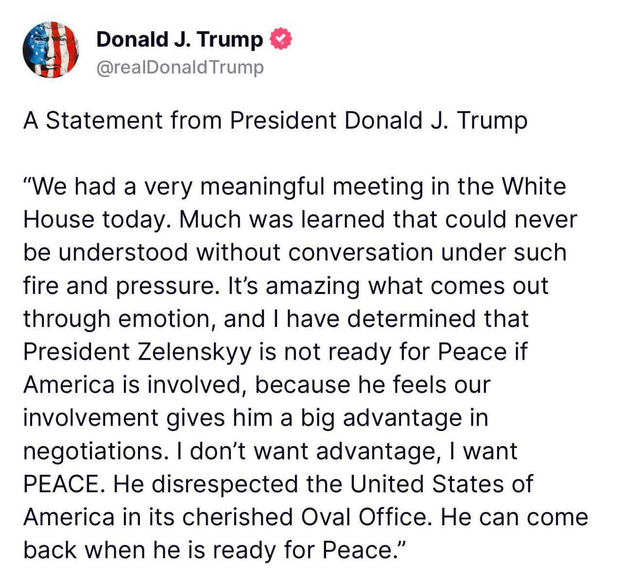 "Сегодня у нас была очень значимая встреча в Белом доме. Было извлечено многое, что никогда не могло быть понято без разговора под таким огнём и давлением. Удивительно, что может проявиться через эмоции, и я пришёл к выводу, что президент Зеленский не готов к миру с участием Америки, потому что он считает, что наше участие даёт ему большое преимущество в переговорах. Я не хочу преимущества, я хочу МИРА. Он проявил неуважение к Соединённым Штатам Америки в их священном Овальном кабинете. Он может вернуться, когда будет готов к миру", - гласит текст публикации.