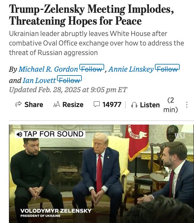 "Внезапное завершение встречи оставило без ответа вопрос о том, какую военную и политическую поддержку администрация Трампа готова предоставить Киеву в ближайшие месяцы", - пишет WSJ.