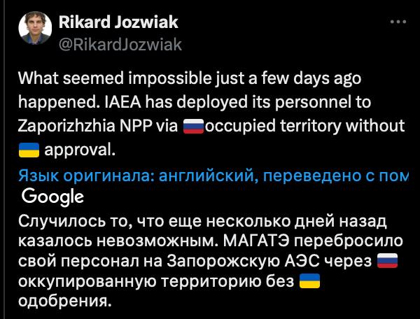 "Случилось то, что еще несколько дней назад казалось невозможным. МАГАТЭ перебросило свой персонал на Запорожскую АЭС через российскую оккупированную территорию без украинского одобрения", - написал он в Х.