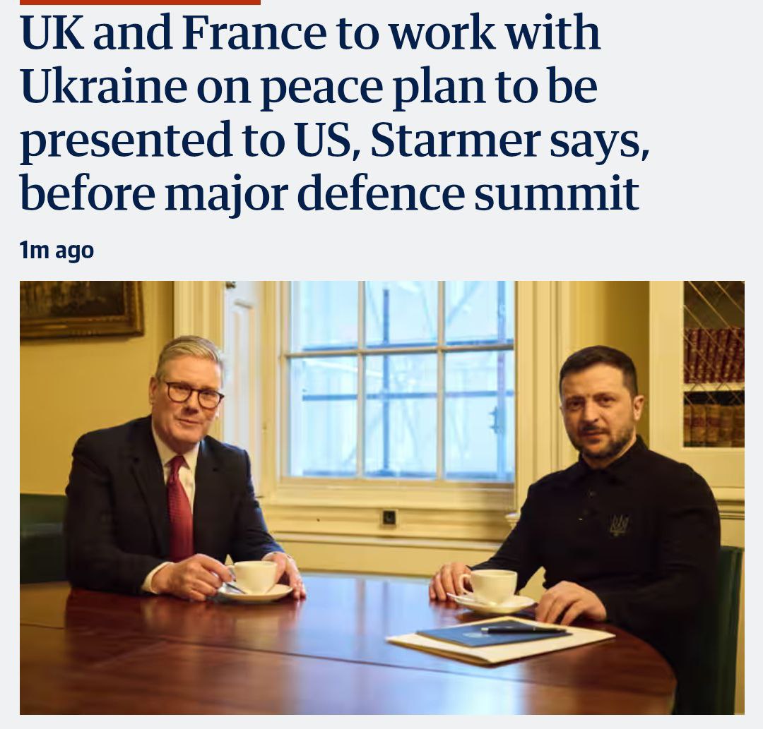 "Великобритания вместе с Францией и, возможно, еще одной или двумя странами будут работать с Украиной над планом прекращения боевых действий, а затем мы обсудим этот план с Соединенными Штатами", - рассказал он.