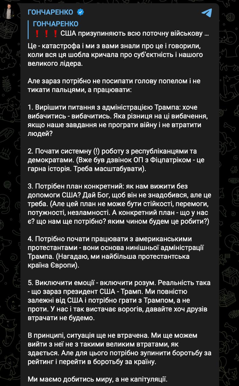 "Реальность такова, что сейчас президент США – Трамп. Мы полностью зависимы от США и нужно играть с Трампом, а не против. У нас и так хватает врагов, давайте хоть друзей терять не будем", - призывает Гончаренко и требует "добиться мира, а не капитуляции".