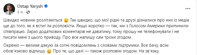 "Быстро новости разлетаются. Так быстро, что мои родные и друзья узнали о них из медиа еще до того, как я успел им рассказать. Если коротко – да, мы с "Голосом Америки" прекратили сотрудничество. Сейчас дополнительных комментариев не буду давать, поэтому прошу не звонить по телефону и не писать мне по этому поводу. Обо всем напишу сам чуть позже", - отметил Ярыш.