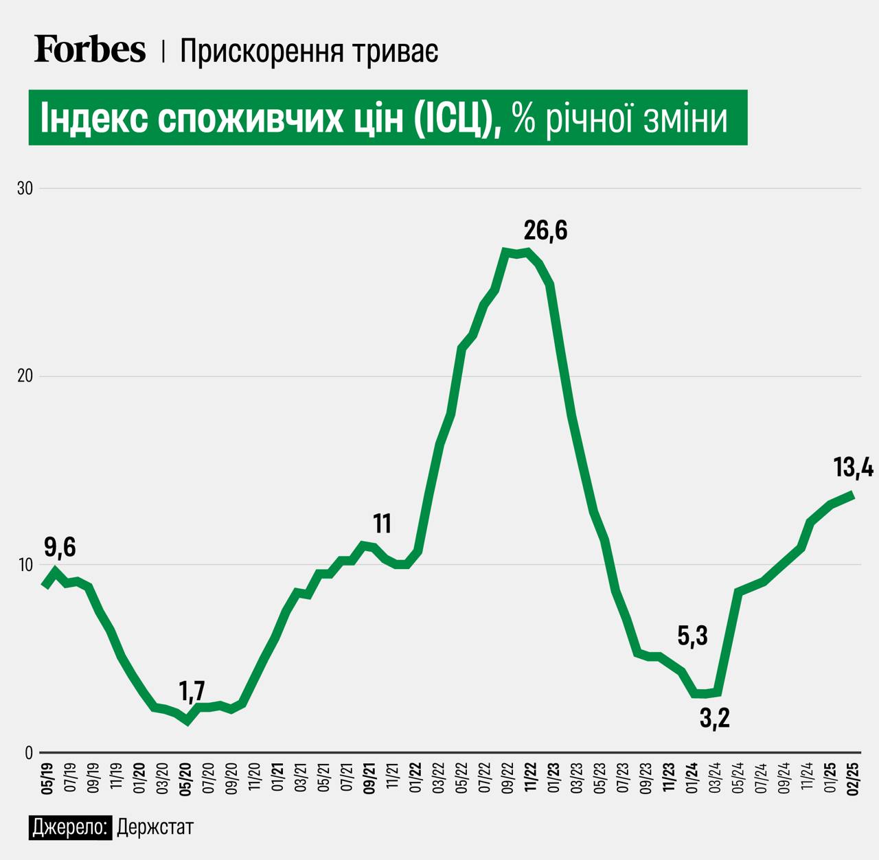 Потребительская инфляция в Украине в феврале 2025 года ускорилась до 13,4% в годовом измерении. При этом в декабре она составляла 12%, а в январе 12,9%.