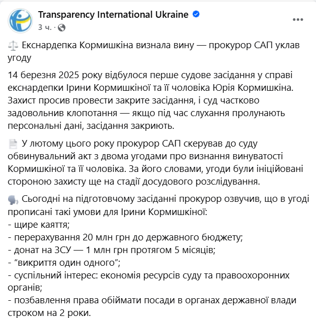 Она обязалась принести "искреннее раскаяние", перечислить 20 млн грн в бюджет, задонатить на ВСУ миллион гривен. Также бывшая "слуга народа" на ближайшие два года лишена права занимать должности в органах государственной власти.