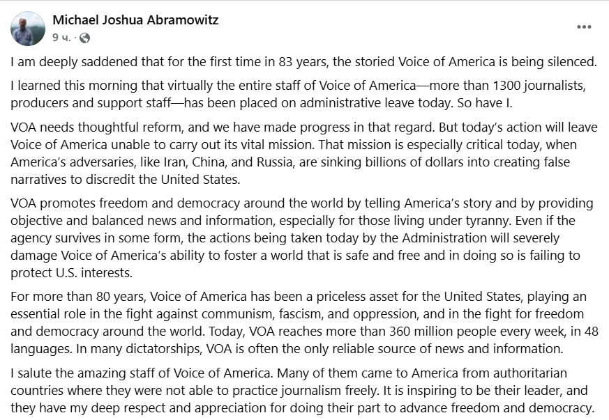 "Я глубоко опечален тем, что впервые за 83 года легендарный "Голос Америки" замолкает. Сегодня утром я узнал, что практически весь персонал "Голоса Америки" - более 1,3 тысячи журналистов, продюсеров и вспомогательного персонала - был отправлен в административный отпуск. И я, в том числе", - говорится в заявлении Абрамовица в Facebook.