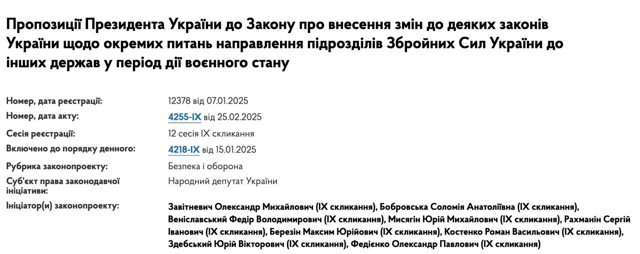 Изначально законопроект об отправке войск парламент принял 15 января, но Зеленский его ветировал. 25 февраля Рада снова приняла его с учетом предложений президента. Тогда документ с поправками Зеленского поддержали 267 депутатов.