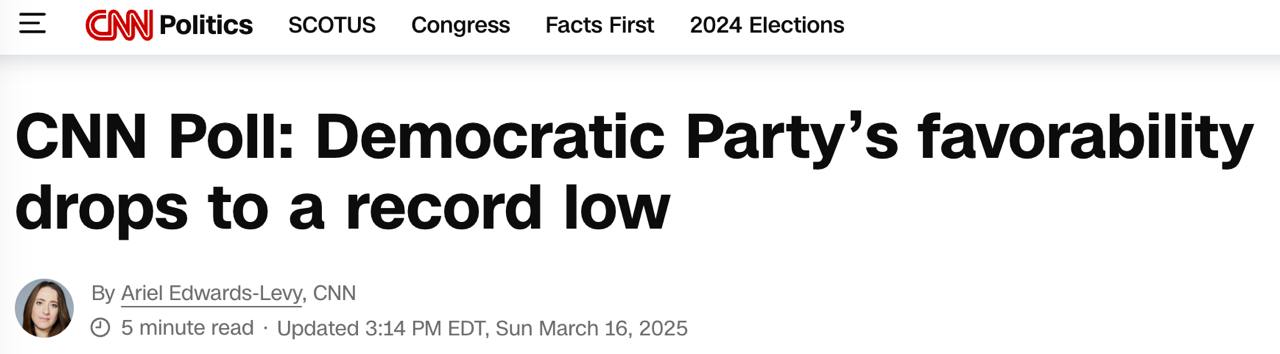 Его опрос показал, что рейтинг поддержки Демпартии сейчас составляет всего 29%. Это самый низкий показатель, зафиксированный в опросах CNN с 1992 года. Он на 20% ниже уровня января 2021 года, когда Дональд Трамп завершил свой первый срок.