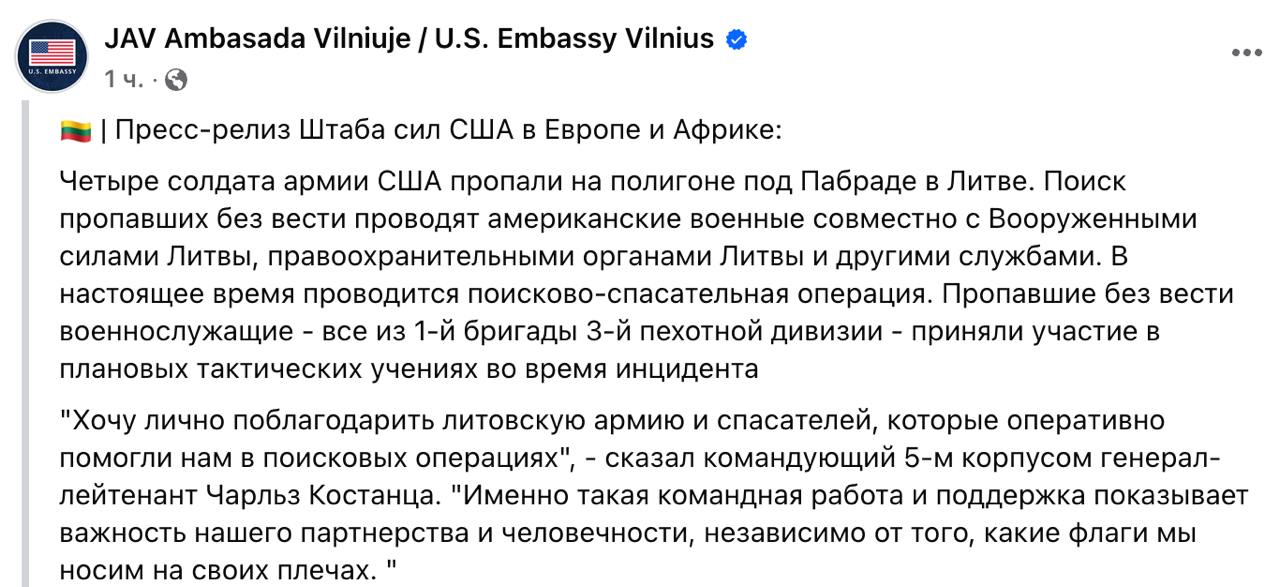 Посольство США подтвердило информацию об исчезновении и поблагодарило литовскую сторону в организации поисков своих граждан.